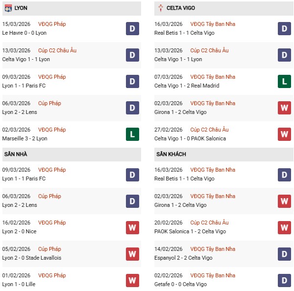 - Lyon hòa 1, thua 1 trong 2 trận gặp Celta Vigo gần đây.