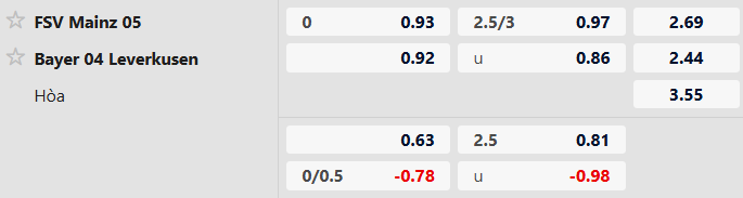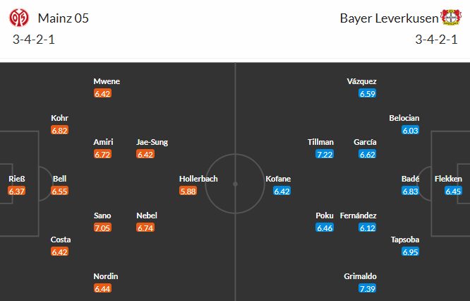 Khá bất ngờ khi Mainz lại đang được xếp hòa đồng banh với Leverkusen ở cuộc đấu này. Bởi đội chủ nhà đang lép vế toàn diện so với các cầu thủ khách trên mọi phương diện. 3 lần đụng độ gần nhất, Leverkusen thắng 2 và chỉ 1 lần để đội chủ nhà cầm chân. Rõ ràng với phong độ hiện tại, sẽ không quá bất ngờ nếu thầy trò Hjulmand có thể thắng dễ thêm lần nữa ngay trên sân khách.
