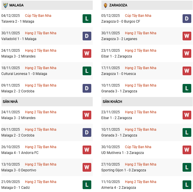 - Malaga thắng 2, hòa 5, thua 3 trong 10 trận gặp Zaragoza gần đây.