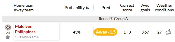 Hàng công của Philippines đã thể hiện được sự ổn định tại chiến dịch vòng loại lần này khi luôn khi ít nhất 2 bàn trong cả 4 trận đấu đã qua. Ở chiều ngược lại, hàng thủ của Maldives lại để thủng lưới tới 10 bàn thua chỉ trong 4 trận đấu tại bảng A. Với việc 4/6 lần chạm trán gần nhất giữa đôi bên chứng kiến tối thiểu 3 bàn thắng được ghi, trận đấu tới được dự đoán sẽ có từ 3 bàn thắng trở lên.
