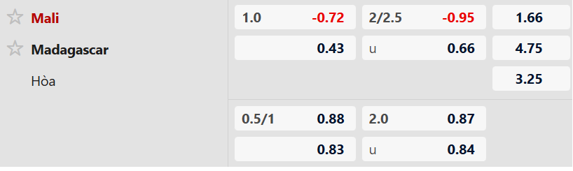 Madagascar thắng kèo châu Á đến 8/9 trận vừa qua ở chiến dịch vòng loại World Cup. Chỉ có Gabon ở bảng F có được thành tích như họ. Còn Mali chỉ thắng kèo châu Á 3 trận. Đội khách đáng tin cậy ở trận này dù có kèo +1.