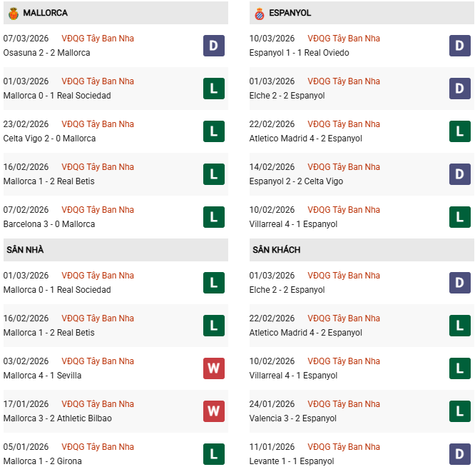 - Trên sân nhà, Mallorca thắng 7, thua 2 trước Espanyol.