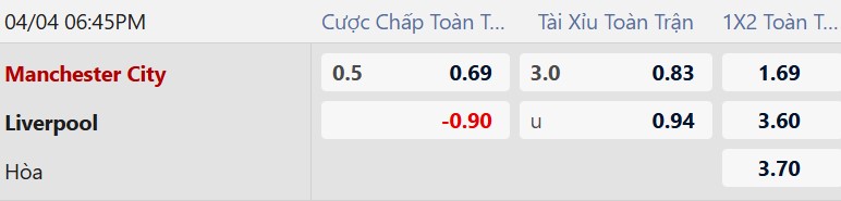Thông tin tỷ lệ kèo bóng đá Man City vs Liverpool: