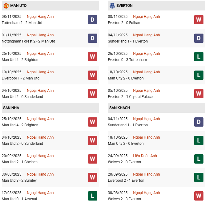 Thống kê phong độ Man Utd vs Everton: