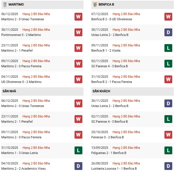 Phong độ gần đây của Maritimo tiếp tục duy trì ở mức tích cực khi họ thắng 6, hòa 1 và chỉ thua 3 trong 10 trận gần nhất. Trên sân nhà, đội bóng áo xanh-đỏ cũng thể hiện bộ mặt khá đáng tin cậy với 5 chiến thắng, 2 trận hòa và 3 thất bại trong 10 lần đón khách gần đây. Trước đối thủ trẻ như Benfica B, Maritimo có đủ cơ sở để chủ động kiểm soát thế trận và tạo ra sức ép liên tục.