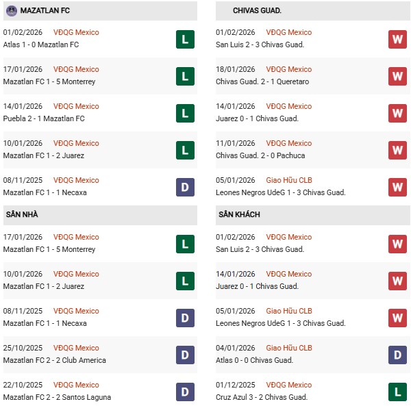 - Trên sân nhà, Mazatlan thắng 1, thua 1 trước Guadalajara.