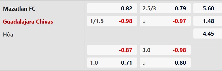 Mazatlan thua tới 8 trong 13 trận đối đầu với Guadalajara có mở kèo châu Á. Mazatlan cũng thua 3 hòa 1 trong 4 trận gần đây theo kèo châu Á. Trong khi đó, Guadalajara thắng 3 trong 4 trận vừa qua và họ cũng thắng 7 trong 9 trận chính thức mới nhất trên sân khách theo kèo châu Á.