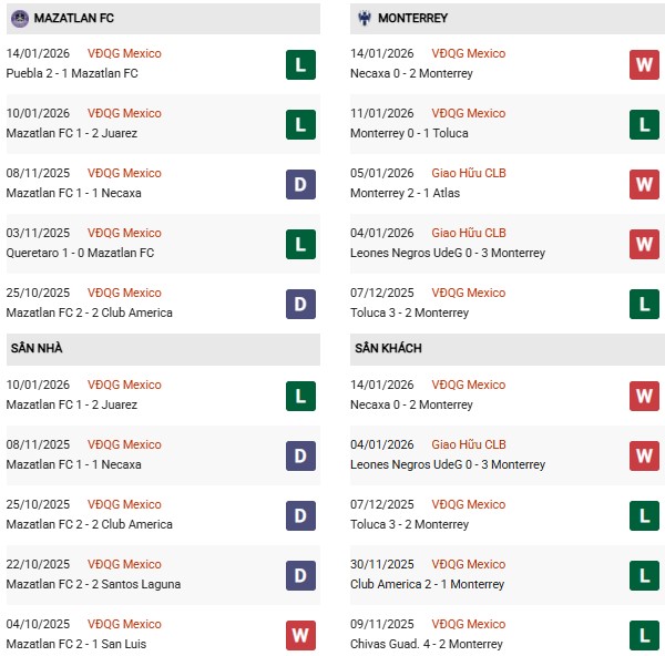 - Trên sân nhà, Mazatlan thắng 1, thua 4 trước Monterrey.