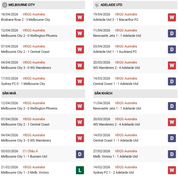 - Trên sân nhà, Melbourne City thắng 3, thua 1 trước Adelaide.