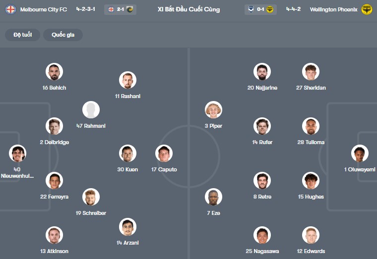 Đội hình dự kiến Melbourne City vs Wellington:
