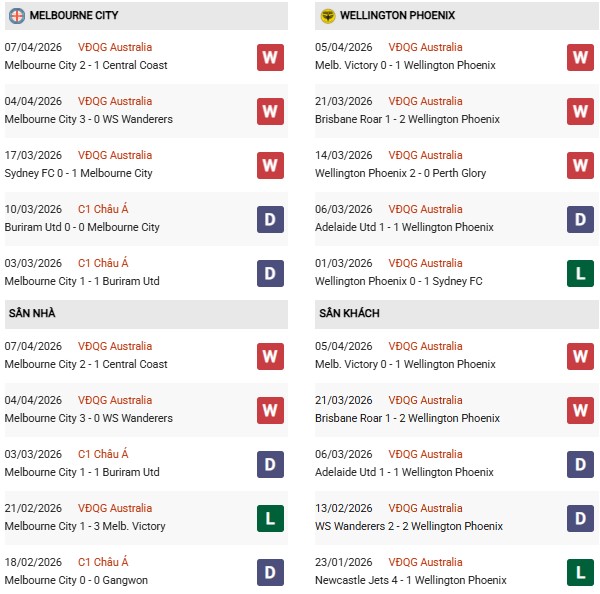 - Trên sân nhà, Melbourne City thắng 6, thua 1 trước Wellington.
