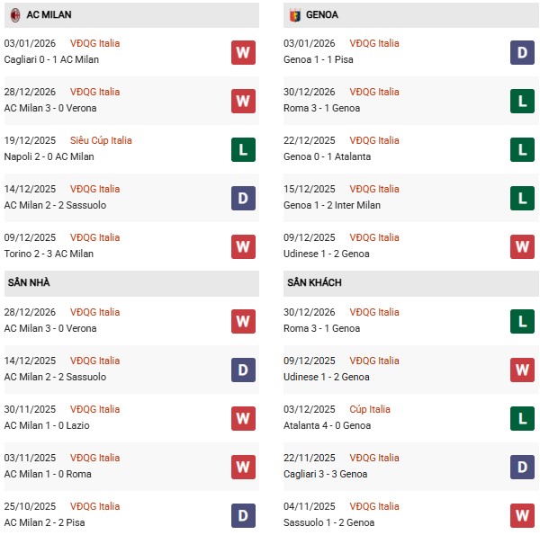 - Milan thắng 5, hòa 4, thua 1 trong 10 trận gặp Genoa gần đây.