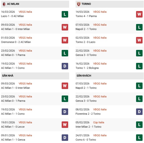 Thống kê phong độ Milan vs Torino: