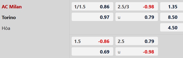 Thông tin tỷ lệ kèo bóng đá Milan vs Torino: