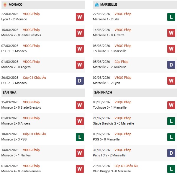 - Trên sân nhà, Monaco thắng 6, thua 4 trước Marseille.