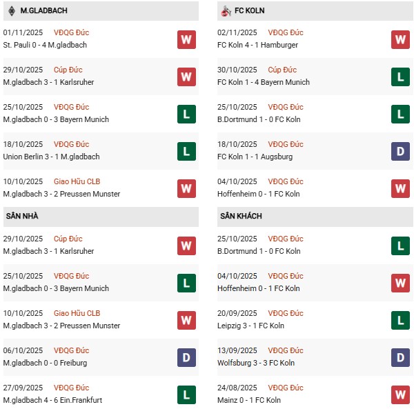 Tân binh FC Koln sở hữu hàng công tương đối ổn: 16 bàn/9 trận đã qua tại Bundesliga 2025/26 và mới tịt ngòi một trận duy nhất. Chiều ngược lại, Monchengladbach thủng lưới trung bình 2 bàn/trận và 5/6 lần ra sân gần nhất của đội bóng này (không tính giao hữu) đã khép lại với không dưới 3 pha lập công. Kết cục này còn xuất hiện ở 8/9 màn tỉ thí mới đây giữa hai đội.
