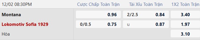 Thông tin tỷ lệ Montana vs Lokomotiv Sofia: