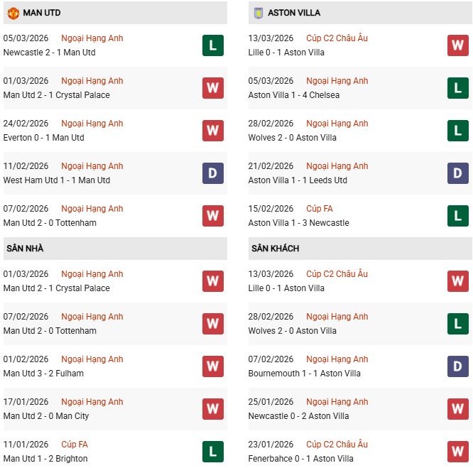 Thống kê phong độ MU vs Aston Villa: