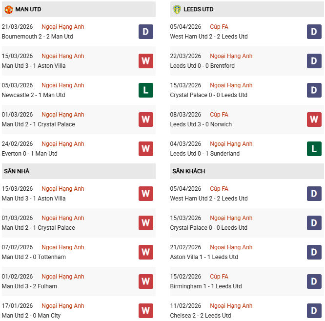 Lịch sử đối đầu tại Old Trafford không ủng hộ Leeds, khi họ đã nhiều năm chưa giành chiến thắng tại đây. Trước một MU có lợi thế sân nhà và chất lượng đội hình vượt trội, Leeds nhiều khả năng sẽ chọn lối chơi thận trọng. Trận đấu vì thế hứa hẹn giằng co, nơi United hướng tới 3 điểm để củng cố vị trí top 4, còn Leeds kỳ vọng ít nhất một kết quả hòa để phục vụ cuộc đua trụ hạng.