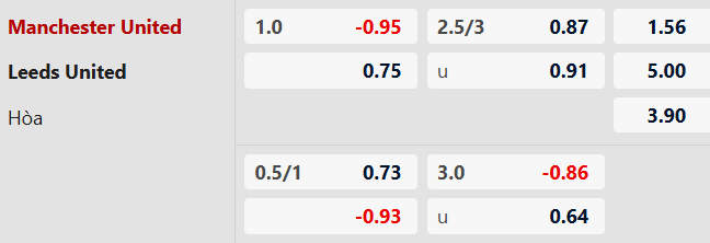 Thông tin tỷ lệ kèo bóng đá MU vs Leeds: