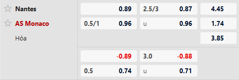 Toàn bộ 7 trận đấu liên tiếp giữa 2 đội đều về Tài chung cuộc. Thậm chí, ở 4 lần gặp mặt gần nhất, AS Monaco đã xé lưới Nantes đến 17 lần. Với tỷ lệ tài xỉu 2 3/4, cơ hội để kèo Tài xuất hiện sau 90 phút là khá rõ ràng với một thắng lợi cách biệt dành cho đội khách.