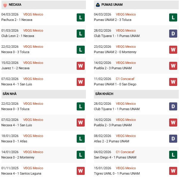 Thống kê phong độ Necaxa vs Pumas UNAM: