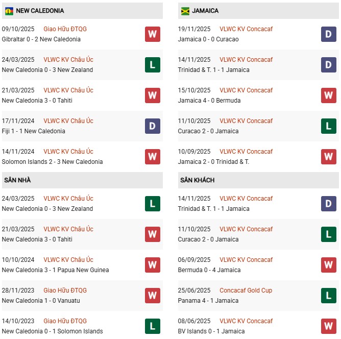 Thống kê phong độ New Caledonia vs Jamaica: