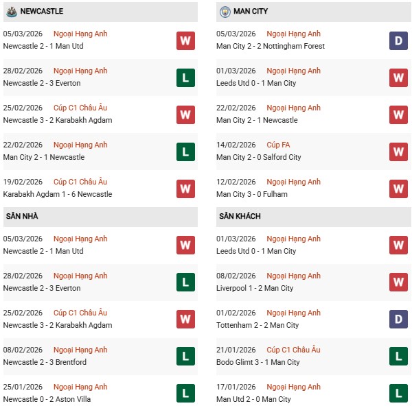 Thống kê phong độ Newcastle vs Man City: