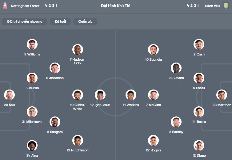 Đội hình dự kiến Nottingham vs Aston Villa: