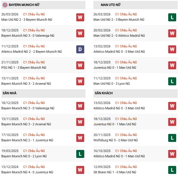 - Nữ Bayern Munich thắng 1, thua 1 trong 2 trận gặp Nữ MU gần đây.