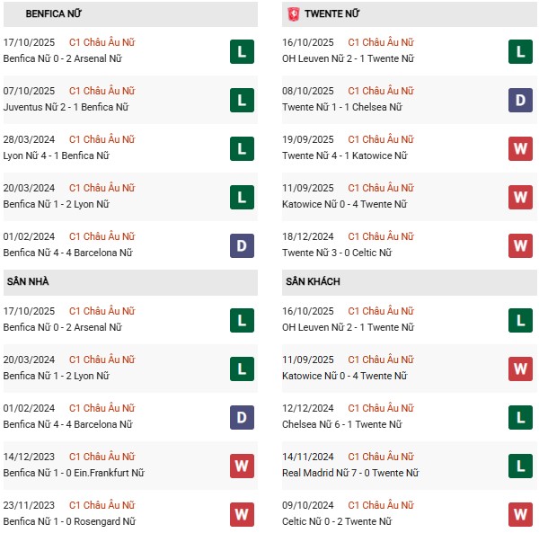 Thống kê phong độ Nữ Benfica gặp Nữ Twente:
