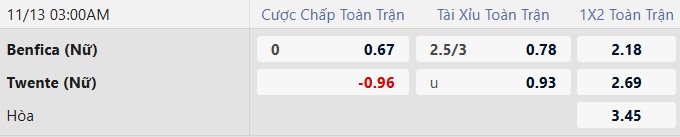 Thông tin tỷ lệ kèo Nữ Benfica gặp Nữ Twente: