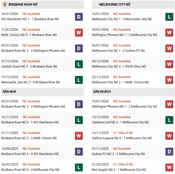 - Trên sân nhà, Nữ Brisbane Roar thắng 2, thua 6 trước Nữ Melbourne City.