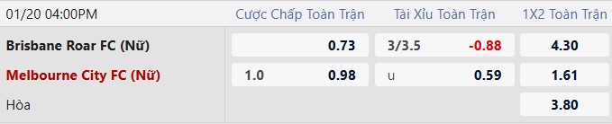 Thông tin tỷ lệ Nữ Brisbane Roar vs Nữ Melbourne City: