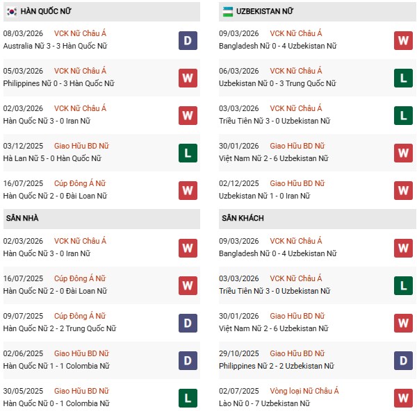 Thống kê phong độ Nữ Hàn Quốc vs Nữ Uzbekistan: