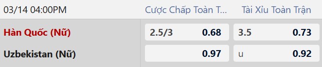 Thông tin tỷ lệ kèo Nữ Hàn Quốc vs Nữ Uzbekistan: