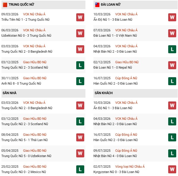 Thành tích đối đầu Nữ Trung Quốc vs Nữ Đài Bắc Trung Hoa: