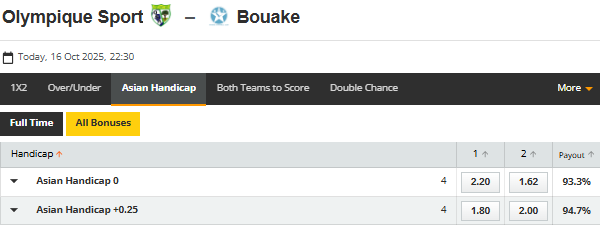 Thông tin tỷ lệ Olympique Sport vs Bouake: