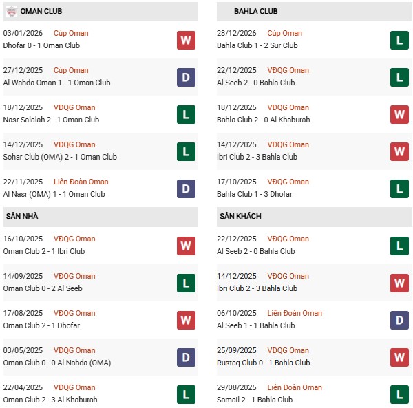 Trong 10 trận gần nhất trên mọi đấu trường, Oman FC chỉ thắng 3, hòa 4 và thua 3, cho thấy sự thiếu bùng nổ. Đáng chú ý, sân nhà vốn được coi là điểm tựa lại không mang lại nhiều lợi thế khi họ chỉ thắng 2/10 trận gần nhất tại đây. Việc thường xuyên mất điểm trên sân nhà khiến Oman FC khó tạo được sự tin tưởng trước cuộc đối đầu với Bahla.