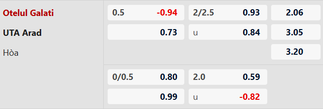 Thông tin tỷ lệ cược Otelul Galati vs UTA Arad: