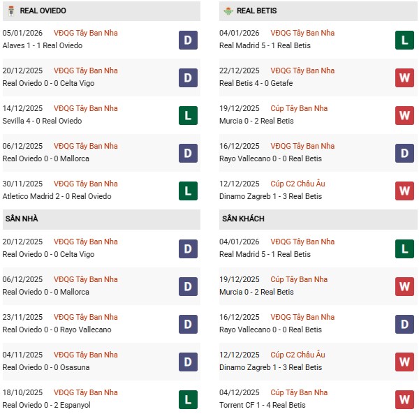 Trận đấu gần nhất giữa hai đội diễn ra vào tháng 2 năm 2000, kết thúc với tỷ số hòa 1-1, nhưng Betis đã thắng 3 trong 4 lần gặp nhau gần nhất. Thực tế là Real Oviedo chưa từng đánh bại Betis tại giải đấu cao nhất bóng đá Tây Ban Nha. Vì vậy, đối đầu với đội bóng tân binh đang gặp rất nhiều khó khăn, đây sẽ là cơ hội dành 3 điểm mà Betis không nên bỏ qua.