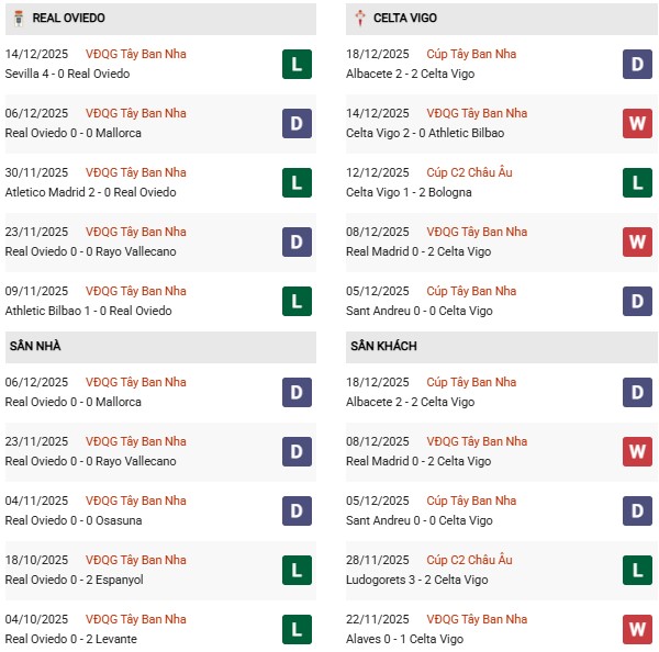 Thống kê phong độ Oviedo vs Celta Vigo: