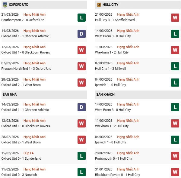 - Trên sân nhà, Oxford thắng 2, hòa 1 trước Hull City.