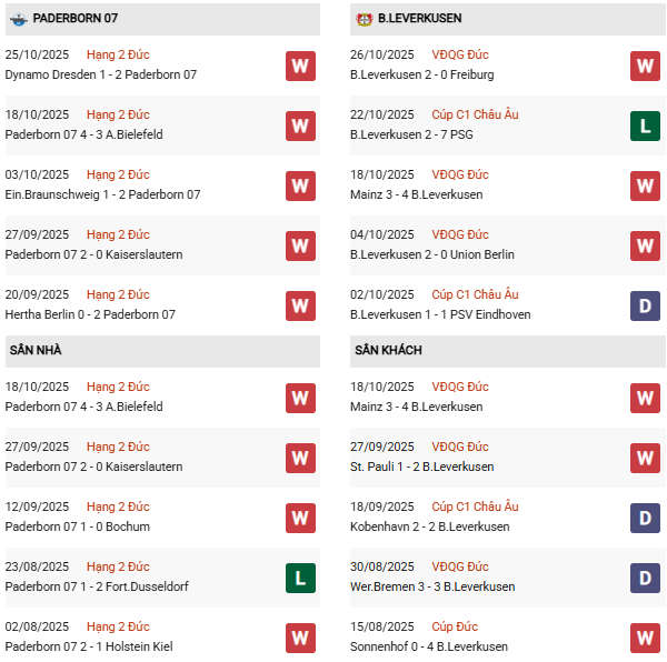 - Paderborn thắng 2, hòa 1, thua 7 trong 10 trận gặp Leverkusen gần đây.