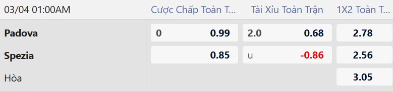 Thông tin tỷ lệ bóng đá Padova vs Spezia: