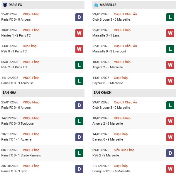 Thống kê phong độ Paris FC vs Marseille: