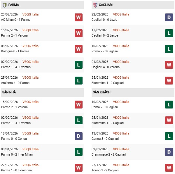 - Parma thắng 1, hòa 4, thua 5 trong 10 trận gặp Cagliari gần đây.