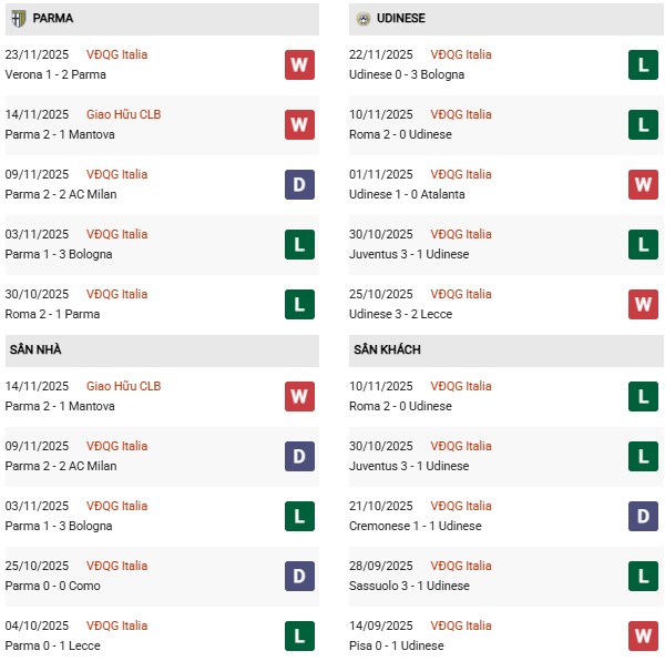 - Trên sân nhà, Parma thắng 5, thua 2 trước Udinese.