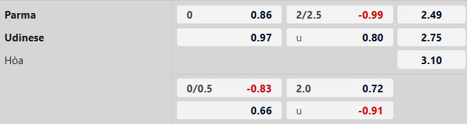 Trên 2 bàn: Cả 5 trận gần đây của Parma đều có tối thiểu 3 bàn. 3/4 trận gần nhất giữa đội bóng này và Udinese số lần lưới rung còn không dưới 4.