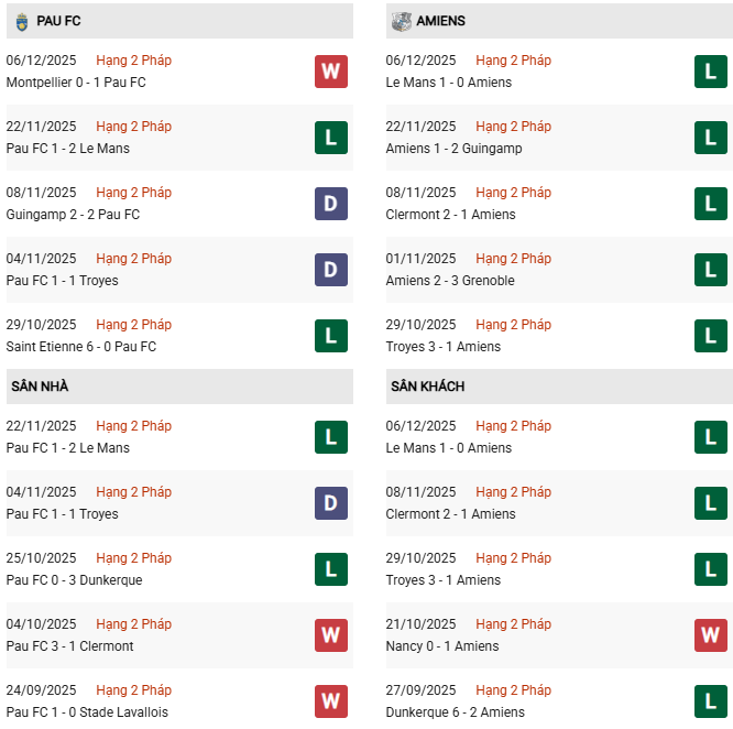 - Pau FC thắng 5, hòa 2, thua 3 trong 10 trận gặp Amiens gần đây.